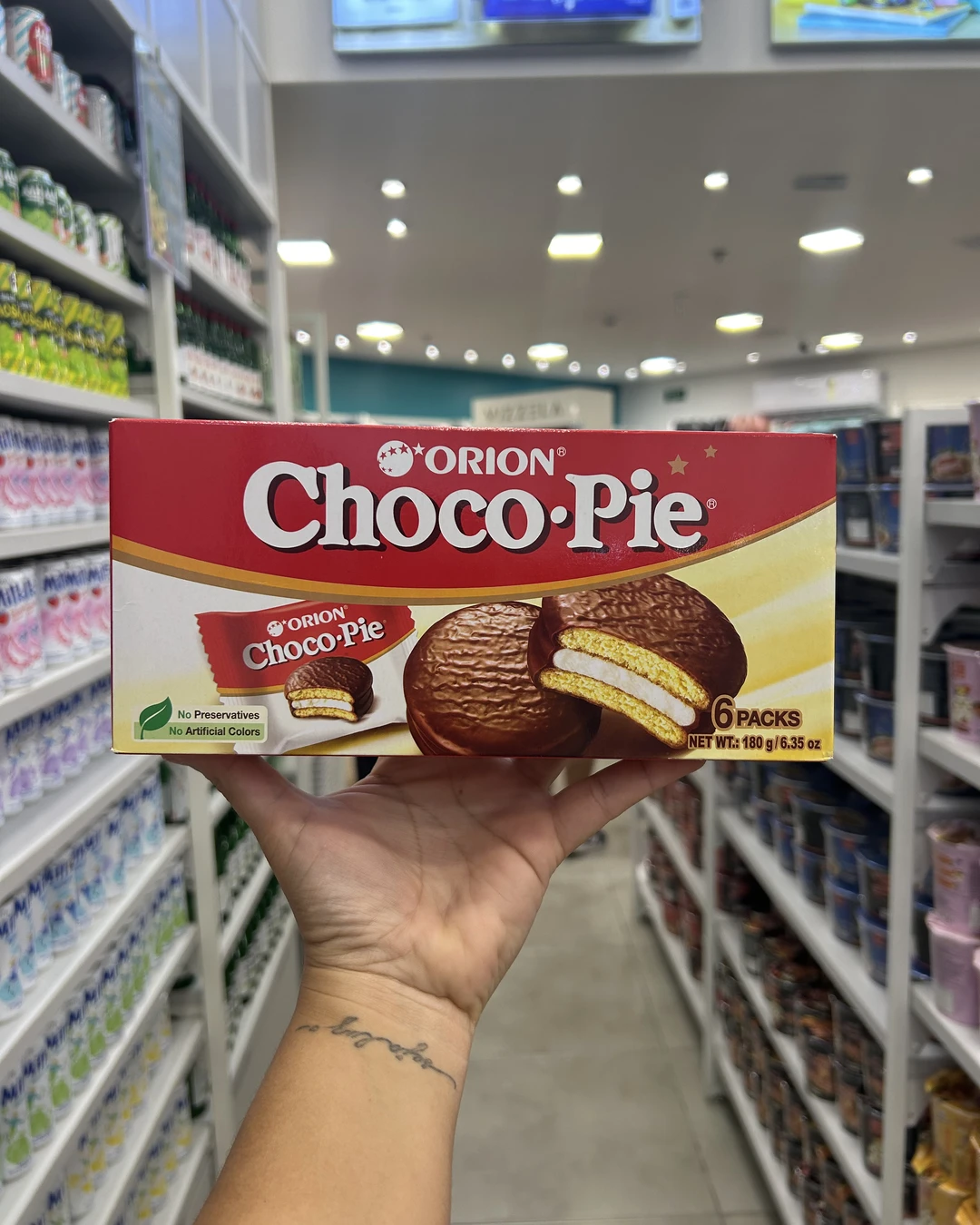 O Bolinho Coreano Choco Pie Lotte com chocolate duplo e marshmallow oferece uma textura macia e crem...