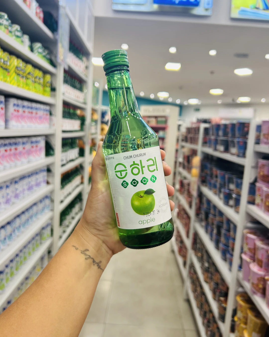 O Soju Chum-Churum Lotte Maçã Verde de 360ml proporciona doçura frutada e leveza alcoólica, idea...