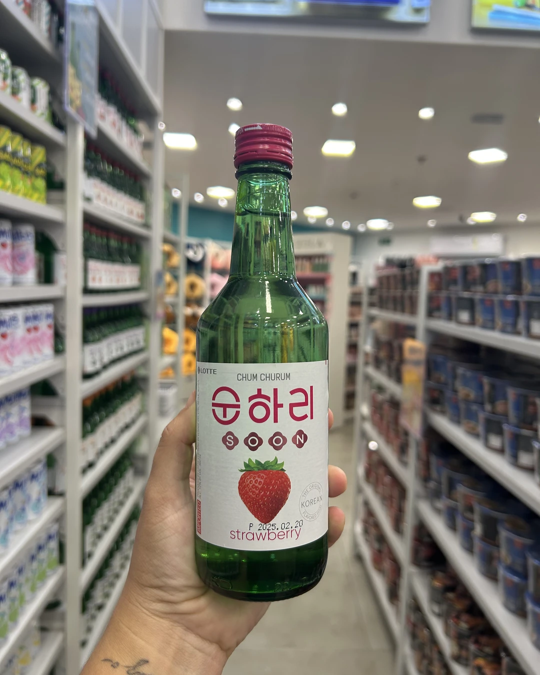 O Soju Chum-Churum Lotte Morango de 360ml proporciona doçura frutada e leveza alcoólica, ideal par...